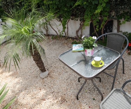 Monolocale che si affaccia sul cortile interno sul retro, dotato di angolo cottura a vista (con ornelli elettrici e frigo) zona pranzo, tv e clima. Zona notte con letto matrimoniale e lettini aggiunti. Bagno con doccia con aerator, lavabo e wc (no bidet). In grado di ospitare tre ospiti grazie ai lettini disponibili (4 su richiesta) – MQ 30.